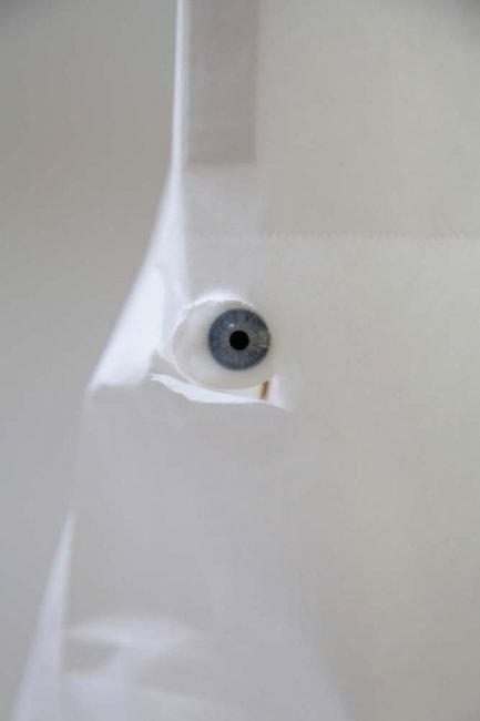 This sculpture is a white paper bag sitting under a perspex box on top of a white plinth. There is a small tear in the paper through which a glass eye is peering. A coil of brass wire inside supports this - in a manner similar to earlier I Spy works. The work makes reference to Spring, when things make their first miraculous appearance from their dormant state. There are other references to wearing a bag or hood on ones head - some comic, some more sinister.