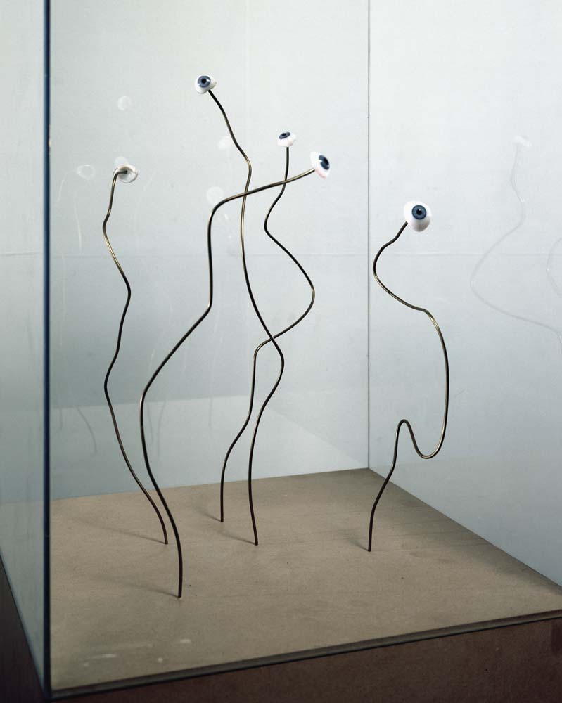 This sculpture is a plinth made of MDF with glass eyes at the end of brass wire stalks protruding from its surface. It has a glass case covering them.