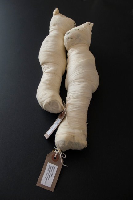 Tabatha is a work comprising 2 objects. They are mummified toy cats ( bought second hand on e-bay – no longer wanted by their original owners). The work was commissioned for a cat museum in Brussels and the resulting 2 objects were the end of a story that unfolded.